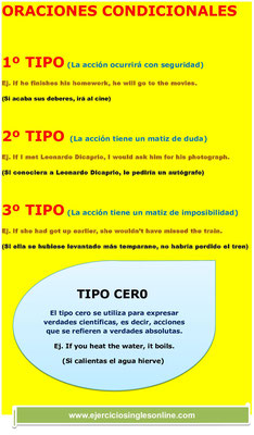 Ponemos a su disposición las principales infografías relacionadas con las ORACIONES CONDICIONALES de nuestra web. Las infografías son una manera rápida de recordar y asimilar contenidos de una manera efectiva. Las infografías relacionadas con las oraciones condicionales en inglés tratan diferentes aspectos, como la formación, el uso de las oraciones condicionales en inglés. También analizamos los diferentes tipos de condicionales y su estructura y formación.