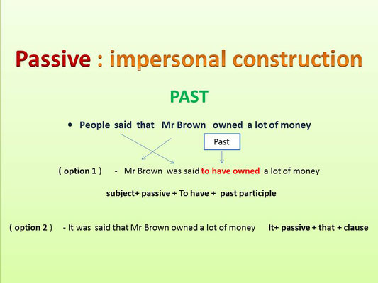 Tense: MODAL VERB Active: She must buy the house. Passive: The house must be bought (by them). |